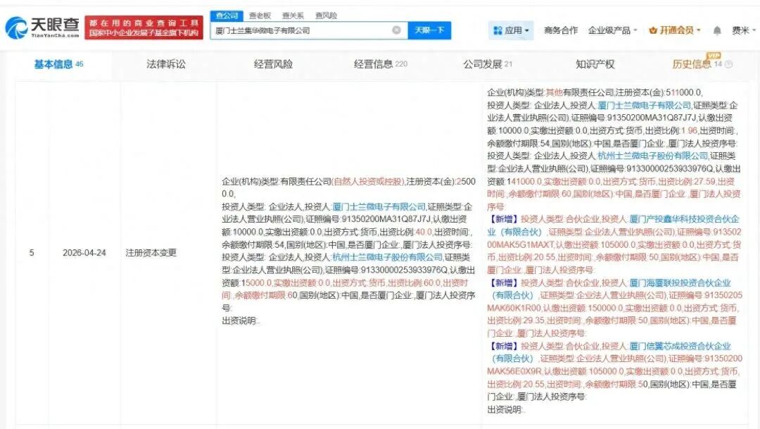 今日半导体媒体消息,厦门士兰集华微电子有限公司近期完成重大工商变更,注册资本从2.5亿元大幅增至51.1亿元,增幅高达1944%。同时,公司引入多家国资背景股东并完成法定代表人更替,一系列动作凸显其深耕高端半导体领域的决心,为国产高端模拟芯片产业发展注入新动能。