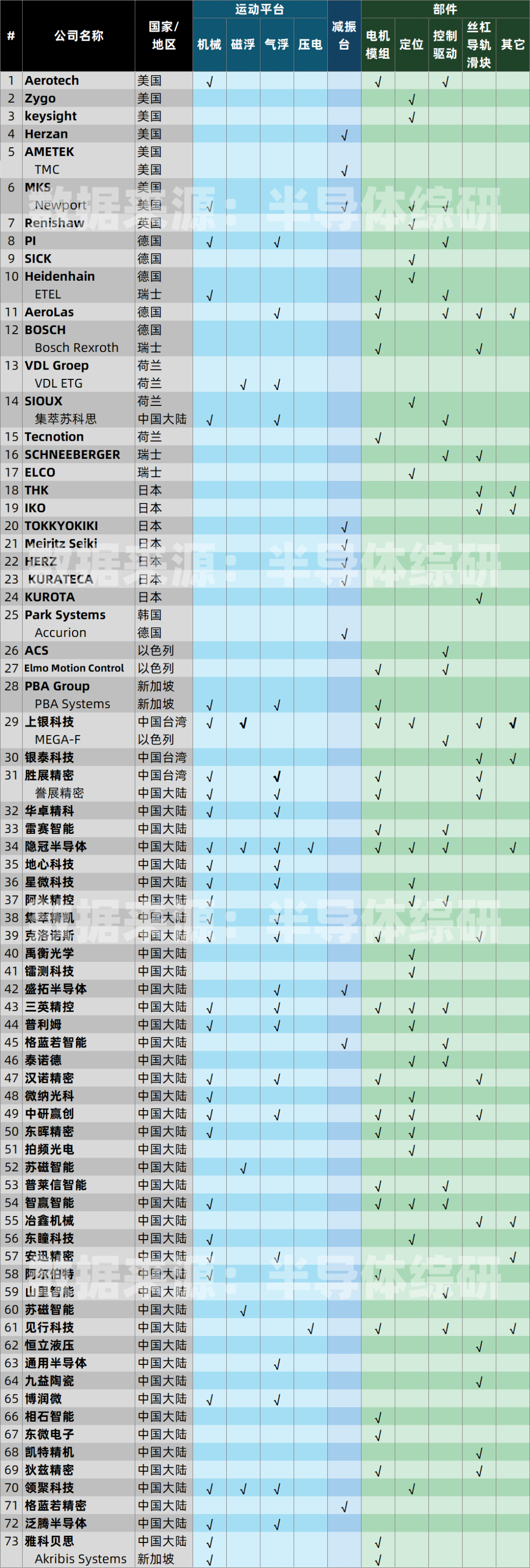 全球半导体设备用运动平台及相关部件供应商统计(73家)