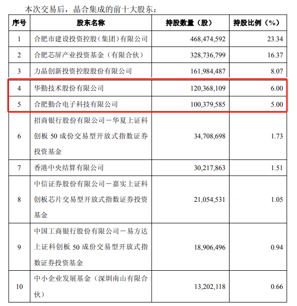 换言之,交易完成后,华勤技术及其全资子公司合肥勤合将合计持有晶合集成220,747,694股股份,持股11.00%。届时,华勤技术将正式超越力晶创投,成为晶合集成的第三大股东。