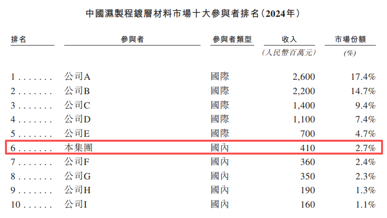 根据弗若斯特沙利文报告,以 2024 年收入计,创智芯联在中国湿制程镀层材料市场所有参与者中排名第六位,占 2.7% 市场份额。同时,以 2024 年收入计,公司也是中国湿制程镀层材料市场最大的国内厂商,且是中国最大的一站式镀层材料及服务供应商。