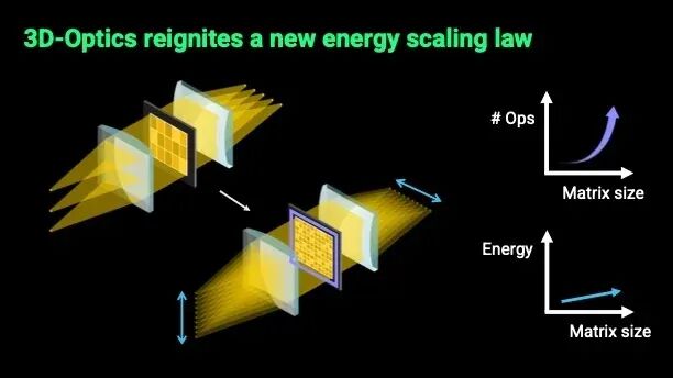 空间光学计算则是利用了光可以在三维空间中传播的特性,在三个空间维度上对光同时进行分束、调制和重组,一次传输就能完成在电子系统或集成光子系统中需要数千个顺序步骤才能完成的矩阵运算,而且几乎零能耗。如果同时利用数百万条光束进行并行计算,随着系统规模扩大,计算速度呈二次方增长。