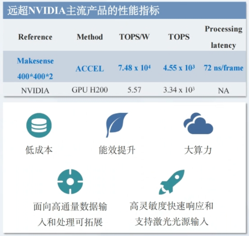 具体来说,与集成光学计算芯片相比,每刻深思的ACCEL由于采用的是空间光计算,是过微纳结构进行计算,集成度高,可做多层计算,计算规模也远大于一维的集成光子计算,目前最高可以做到“400×400×2矩阵”(远高于集成光学计算方案的曦智科技的PACE2的“128×128矩阵”),光学计算性能最高可达4550TOPS(FP8),超过了英伟达H200;光学计算能效比最高可达7.45×10⁴ TOPS/W,相比H200提升了4个数量级,这几项项指标均居于全球领先地位。
