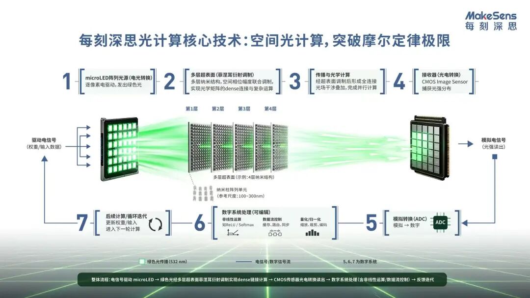 为了解决传统空间光学计算系统所面临的小型化难题,作为国内空间光学技术领域的开拓者,每刻深思则利用超表面技术将庞大的光学透镜集成到几十纳米厚的薄膜上,并完全兼容现有的CMOS半导体晶圆制造工艺,再结合MicroLED光源,使得整个空间光学计算系统的向芯片化、薄膜化方向演进。