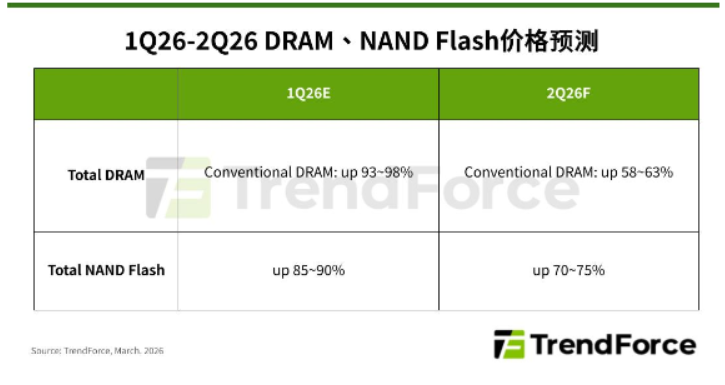 •预估2Q26一般型DRAM合约价格季增58-63%,NAND Flash合约价格季增70-75% •DRAM原厂积极将产能转向Server(服务器)相关应用,尽管部分终端需求面临下修风险,整体供给持续紧缩、价格仍维持上行趋势 •NAND Flash产能向Enterprise SSD(企业级SSD)倾斜,消费应用因价格压力缩减规格 March 31, 2026 ---- 根据TrendForce集