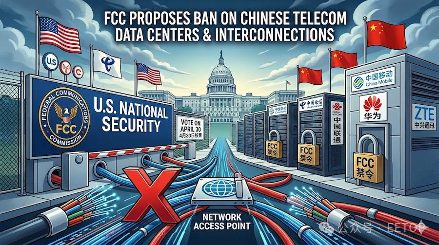 关注公众号,点击公众号主页右上角“ · · · ”,设置星标,实时关注旺材芯片最新资讯美国联邦通信委员会(FCC)表示,可能禁止三家中国大型电信企业在美国运营其数据中心,并禁止美国电信运营商与这些中国运营商互联互通。FCC 称,已初步认定应禁止在美国运营的美国及其他电信运营商,与所谓 “受管制清单” 上的企业互联互通;该机构表示,这些企业(包括中国移动、中国电信、中国联通)对美国国家安全构成威胁。