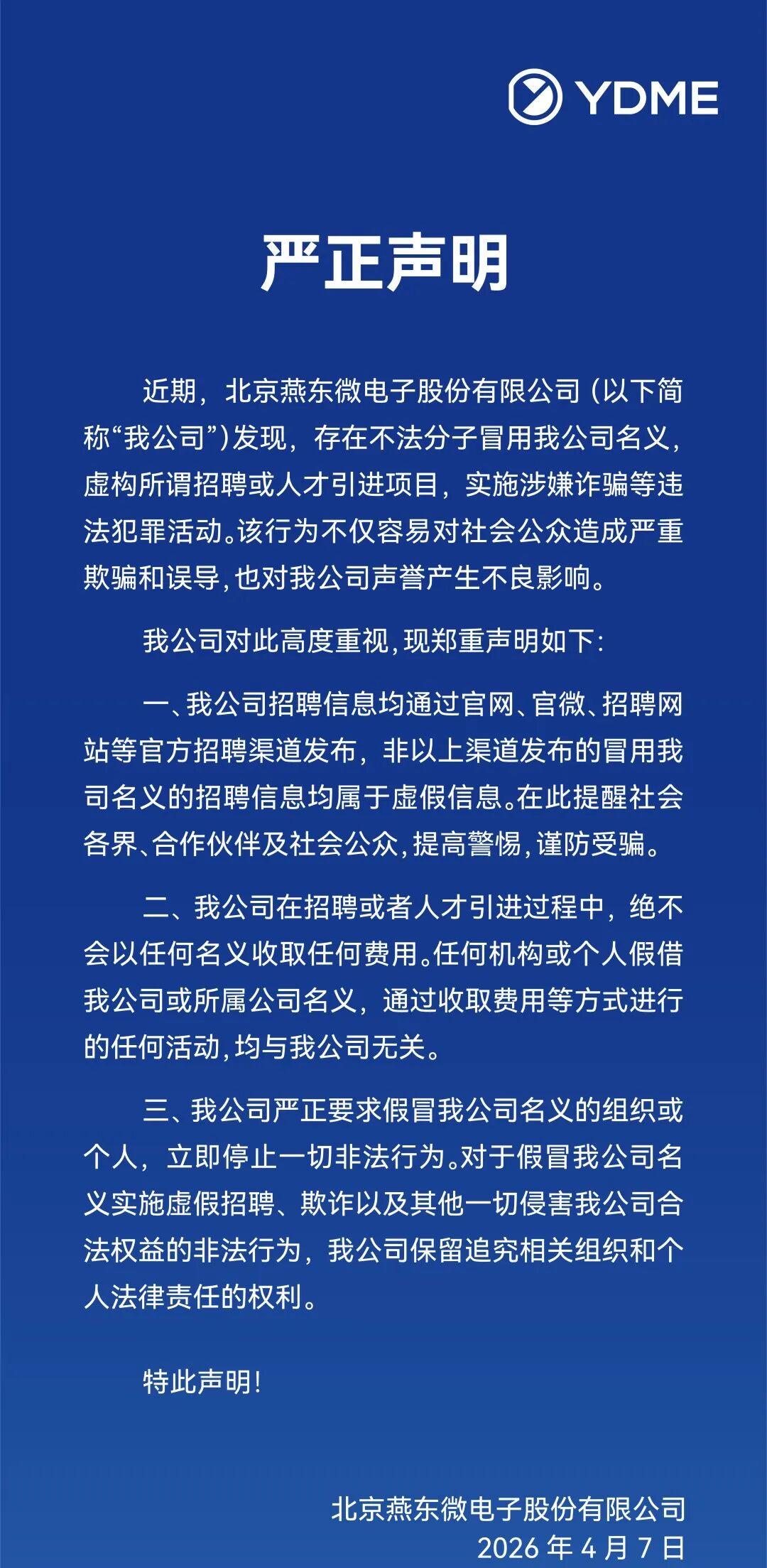 免责声明:本号内容仅作交流学习,非商用,侵权可联系15150147049微信删除,未经允许禁止转载,违者将依法追究相关责任。北京燕东微电子于2026年4月7日发布郑重声明,就近期出现的冒用公司名义实施诈骗的情况作出严正回应。声明中指出,有不法分子假借燕东微电子的名义,发布虚假的招聘及人才引进信息,以此骗取求职者信任,实施诈骗行为,此类行为已对公司声誉造成不良影响。燕东微明确强调,公司官方招聘信息仅