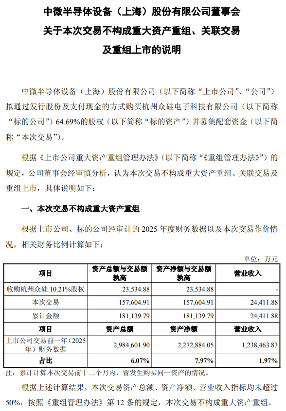 近日,国产半导体设备龙头企业中微公司发布公告,宣布拟通过发行股份结合支付现金的方式,收购杭州众芯硅、宁容海川等41名交易对方合计持有的杭州众硅64.69%股权,此次交易对价约为15.76亿元。与此同时,中微公司计划募集不超过15亿元配套资金,用途涵盖高端半导体设备产业化、研发中心建设、现金对价支付、中介机构费用及流动资金补充。值得关注的是,这不仅是中微公司成立二十余年以来,首次以发行股份的形式实施