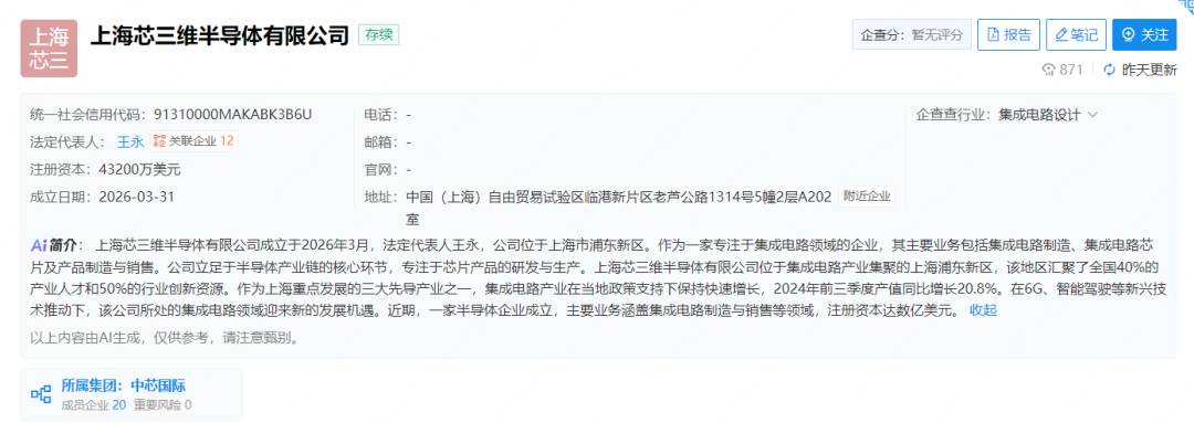 大陆晶圆代工巨头中芯国际近日在上海自贸试验区成立全资子公司:芯三维半导体,注册资本为4.32亿美元,展现其布局先进封装领域的企图心。陆媒分析,新公司拟将先进封装从研发阶段推向产业化,补足中芯国际原本相对不足的后段封装环节,应对AI芯片与高阶算力芯片的封装需求。来源:企查查综合媒体报道,随着制程微缩逐渐逼近物理极限,先进封装已成为提升算力与降低功耗的关键路径,也是全球半导体巨头的兵家必争之地。中芯国