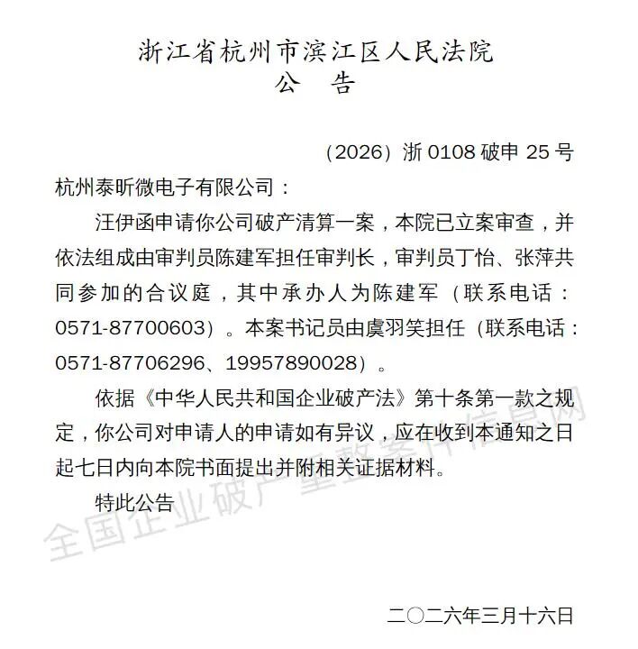 免责声明:本号内容仅作交流学习,非商用,侵权可联系15150147049微信删除,未经允许禁止转载,违者将依法追究相关责任。近日杭州市滨江区人民法院发布破产审查公告,正式受理对杭州泰昕微电子有限公司的破产审查申请,案号为(2026)浙0108破申25号。这意味着这家曾专注于IGBT、SiC功率模块研发的国产芯片企业,已陷入司法程序中的困境,成为国内功率半导体行业整合洗牌期的又一代表性案例。公开信息