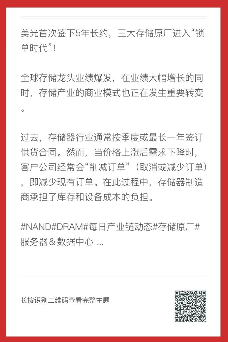 一、美光首次签下5年长约,三大存储原厂进入“锁单时代”!全球存储龙头业绩爆发,在业绩大幅增长的同时,存储产业的商业模式也正在发生重要转变。过去,存储器行业通常按季度或最长一年签订供货合同。然而,当价格上涨后需求下降时,客户公司经常会“削减订单”(取消或减少订单),即减少现有订单。在此过程中,存储器制造商承担了库存和设备成本的负担。长按识别二维码查看完整主题二、三星罢工定了!专家最新解读该事件的影响