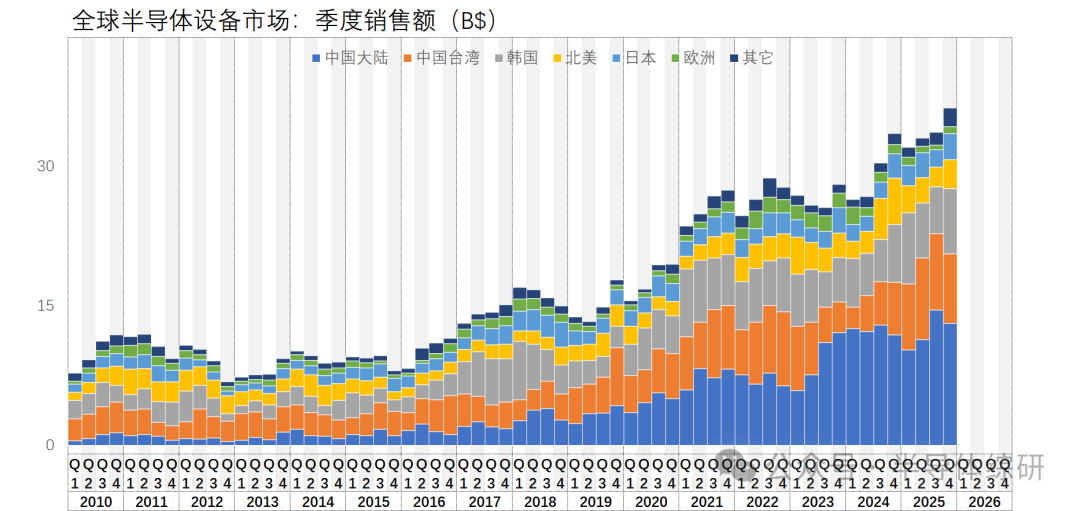 最近,SEAJ官网终于公布了去年Q4的全球半导体设备市场数据(数据来源:SEAJ、SEMI)。单季度市场规模362.8亿美金,同比增加8.1%,环比增加7.8%。由下图可见,设备市场数据在稳定了4个季度以后终于再次发力上涨了。其中原因也很容易理解 -- 根据我个人推算,今年全球芯片市场将达到1.1万亿美金的规模(见下图)。下游高端算力芯片和存储器芯片都大面积缺货的背景下,各大晶圆厂大规模扩产已经提
