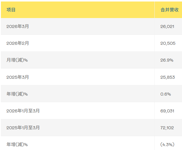 文章内容及信息来源:友达光电、群创光电如有侵权,请联系我们删除友达光电公布2026年3月自行结算合并营收为新台币260.2亿元,较上月增加26.9%,与去年同期相比增加0.6%。累计2026年第一季合并营业额为新台币690.3亿元,较上季減少1.6%,与去年同期相比減少4.3%。单位:新台币百万元截图来源:友达光电群创光电公布2026年3月自结合并营收为新台币250亿元,较上月增加27.82%,较
