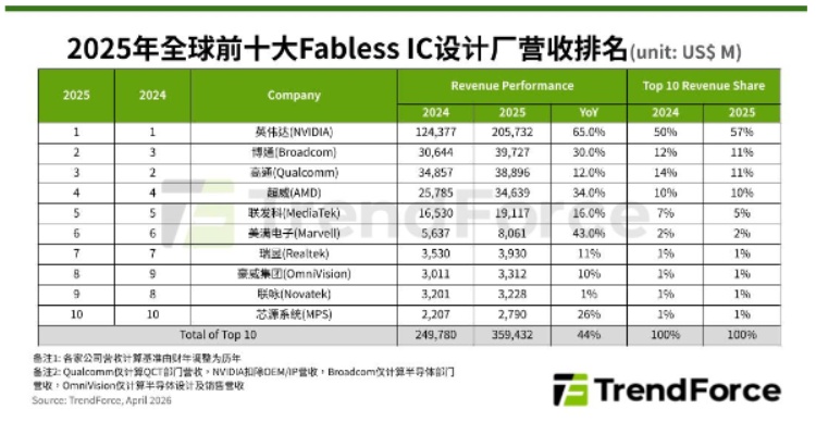 April 1, 2026 ---- 根据TrendForce集邦咨询最新调查,2025年各大云端服务供应商(CSP)持续购买GPU、自研ASIC建置算力需求,带动AI相关芯片设计业者成长,全球前十大无晶圆IC(Fabless IC)设计公司合计营收逾3,594亿美元,年增44%。NVIDIA(英伟达)蝉联营收冠军,Broadcom(博通)因受惠AI浪潮较深,排名上升至第二名,超过消费性电子营收占