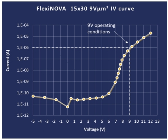 中国,北京—2026年4月1日—Aledia,下一代microLED技术先驱企业,今日宣布,工作电压为9伏特的FlexiNOVA microLED产品(型号FN1530F9)正式实现商用化上市。 图一:FlexiNOVA 15×30 9V µm2 — IV特性曲线 本次产品发布是microLED行业一项重要的产业里程碑。Aledia是全球首家也是目前唯一一家以3D纳米线技术为基础推出9V micr