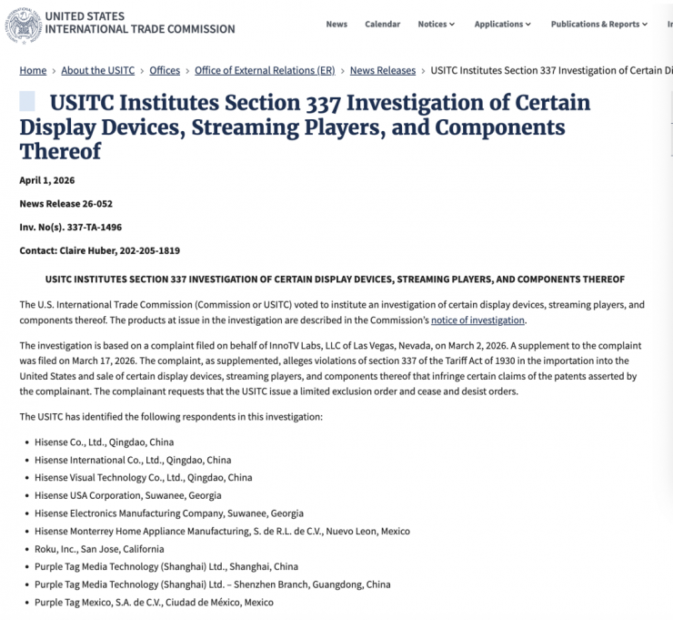 两天内两次出手,美国对华电子产品的专利“围堵”正在加速! 当地时间4月1日,美国国际贸易委员会(USITC)通过投票决议,正式对部分显示设备、流媒体播放器及其相关组件启动337调查,案件编号为337-TA-1496。 值得警惕的是,这是美国两天内第二次对中国电子产品启动同类337调查。就在3月30日,USITC刚对“具备视频功能的电子设备(含智能电视、显示器及组件)”启动调查,当时TCL、海信相关