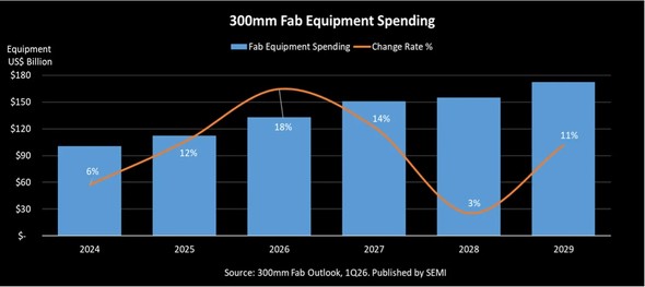 SEMIは2026年4月1日(米国時間)、世界の300mmファブ装置への投資額が、2026年から2年連続で2桁成長するとの予測を示した。2026年は前年比18%増の1330億米ドル、2027年は同14%増の1510億米ドルとなる見込みだ。なお、2028年は同3%増の1550億米ドル、2029年は同11%増の1720億米ドルと予測する。 300mmファブ装置への投資額の推移[クリックで拡大] 出所: