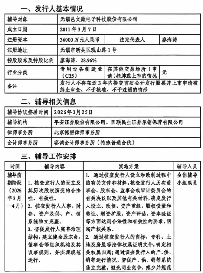 2026年4月2日,证监会披露了平安证券股份有限公司关于无锡邑文微电子科技股份有限公司(简称 “邑文科技”)首次公开发行股票并上市辅导备案的报告。邑文科技辅导机构已变更为平安证券、国联民生证券承销保荐。 无锡邑文微电子科技股份有限公司(“邑文科技”)成立于2011年,系国家级专精特新"小巨人"企业,是中国领先的半导体设备制造商之一,致力于成为全球的半导体、泛半导体高端微纳高科技装备制造业的领军企业