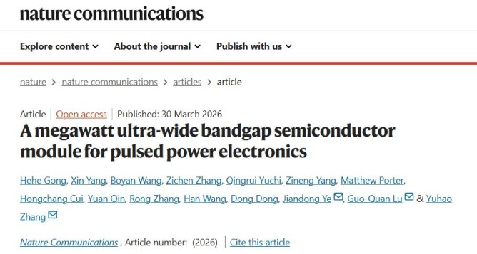 近日,香港大学先进半导体与集成电路中心张宇昊教授团队联合弗吉尼亚理工大学材料科学与工程系Guo-Quan Lu教授团队,以及南京大学电子科学与工程学院叶建东教授团队,在《Nature Communications》上发表题为“A megawatt ultra-wide bandgap semiconductor module for pulsed power electronics”的研究论文。文