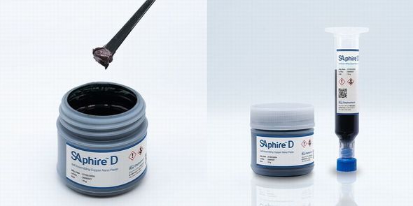 低温焼結で40MPa超の高い接合強度と体積抵抗率6.4μΩ・cmを実現 エレファンテックは2026年3月、次世代パワー半導体向け接合材として、自己組織化銅ナノ粒子(SA-CuNP)を用いた低温焼結型ナノペースト「Saphire D」を開発したと発表した。 Saphire Dは、「ミクロンサイズの銅粒子表面がナノサイズの銅粒子で被覆されることで、全体が大きなナノ粒子のように振る舞い、低温で焼結する」