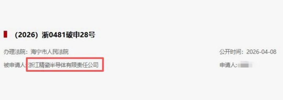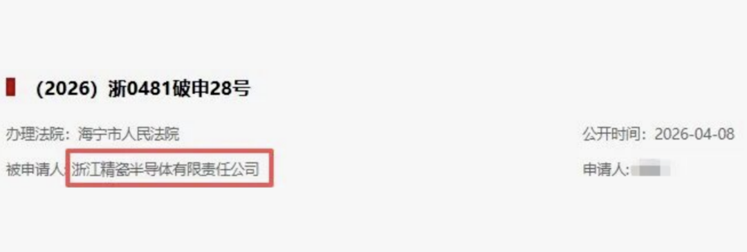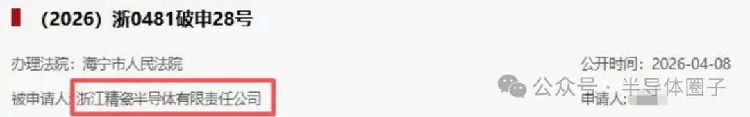 4月14日,根据海宁市人民法院公开的 (2026) 浙 0481 破申 28 号破产审查案件,浙江精瓷半导体有限责任公司因经营危机进入破产司法程序。浙江精瓷半导体有限责任公司是一家专注于覆铜陶瓷基板研发、生产和销售的高新技术企业,成立于2020年12月8日,注册资本7243.58万元,专业生产DBC、DPC、AMB工艺的覆铜陶瓷基板,产品广泛应用于IGBT、固态继电器、新能源汽车、光伏风电、航空航