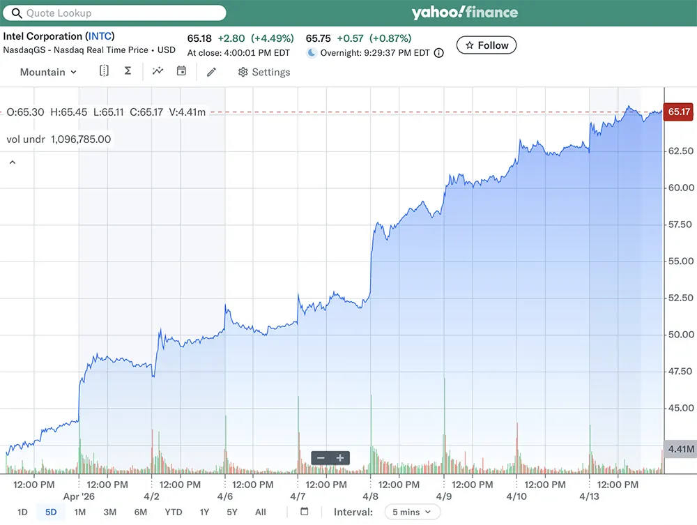 半导体行业圈 振兴国产半导体产业!美东时间本周一,其股价再涨4.49%,实现连续9日上涨,创下有记录以来最佳九日表现。英特尔股价在最近9个交易日内大涨飙升58%,市值暴涨超1200亿美元(约合人民币8184亿元),迅速成为标普500指数中最炙手可热的股票之一。英特尔过去两周一连串利好消息,重新点燃了投资者对这家芯片制造商“逆袭”的期待。此前多年,市场一直担忧其在半导体制造领域已失去竞争优势。本轮上