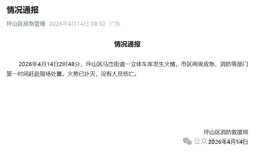 2026 年 4 月 14 日凌晨 2 时 48 分,深圳市坪山区马峦街道比亚迪坪山园区内一立体车库发生火情,现场出现明显火光与大量浓烟,相关画面在社交平台传播后引发广泛关注。接警后,市区两级应急、消防等部门第一时间赶赴现场处置,截至当日上午,明火已被全面扑灭,事故未造成任何人员伤亡。二、官方通报与企业官方回应坪山区消防救援局官方通报2026 年 4 月 14 日 8 时 32 分,深圳市坪山区消