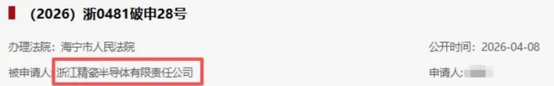 免责声明:本号内容仅作交流学习,非商用,侵权可联系15150147049微信删除,未经允许禁止转载,违者将依法追究相关责任。4月14日,根据海宁市人民法院公开的 (2026) 浙 0481 破申 28 号破产审查案件,浙江精瓷半导体有限责任公司因经营危机进入破产司法程序。浙江精瓷半导体有限责任公司是一家专注于覆铜陶瓷基板研发、生产和销售的高新技术企业,成立于2020年12月8日,注册资本7243.