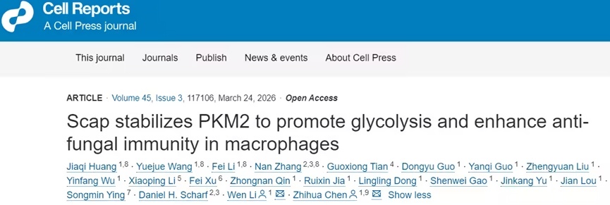 真菌感染可诱导巨噬细胞发生显著但机制尚不明确的代谢重编程。 2026年3月13日,浙江大学陈志华及李雯共同通讯在Cell Reports 在线发表题为Scap stabilizes PKM2 to promote glycolysis and enhance anti-fungal immunity in macrophages的研究论文。 研究证明,真菌刺激会降低人类单核细胞和小鼠骨髓来源巨噬细