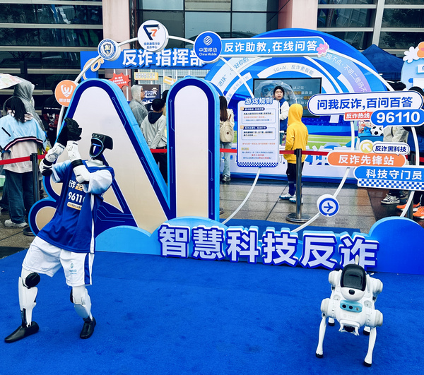 4月11日,2026苏超揭幕战现场,观众席尚未沸腾,入场通道却已率先“燃”了起来。由江苏移动携手信息通信行业反诈中心、江苏省信息通信行业反诈联盟、常州市公安局共同打造的反诈主题宣传活动,在球迷必经的入场区域火热开讲,紧抓开幕式前的一个半小时,用智能机器狗、AI互动机器人、反诈盲盒、AI合拍机等一项项创意互动,把反诈知识“踢”进了万千球迷心中。 反诈主题宣传活动现场 科技感拉满,创意互动“圈粉”无数