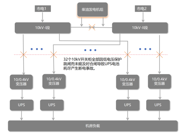 1. 某数据中心终端断电事故分析某数据中心为两家银行提供业务服务,事发时数据中心两路外市电电压同时骤降近50%,持续数秒,导致数据中心32台10/0.4kV变压器10kV侧开关柜综合保护因投入的欠压保护动作跳闸。由于柴油发电机组并在10kV母线,外电扰动时间过短没有启动,也无法直接给0.4kV母线供电。事故发生后,运维工程师因故障排查、穿戴防护装具、开关柜位置分散等原因,合闸操作处置不及时,部分机