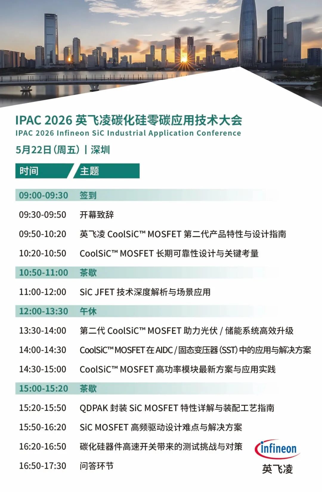 自2014年首届举办以来,IPAC英飞凌零碳工业应用技术大会已走过十二载征程。我们始终以“驱动工业低碳转型”为使命,深耕零碳技术领域,累计吸引上万名行业精英、专家学者及企业代表参与,成为业内最具影响力的标杆盛会。2026年,IPAC大会全面升级,开启双技术峰会新篇章!为进一步聚焦零碳技术前沿,英飞凌将于2026年首次推出两大主题技术大会,诚邀您共襄盛举:英飞凌碳化硅零碳应用技术大会时间:2026年