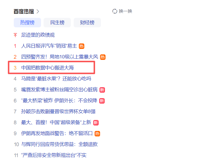 今天是《智慧海洋圈子V》陪伴您的第 3981 天今日,央视新闻发布的一篇深度报道《看见2030“十五五”新图景丨中国把数据中心搬进大海 节能省地又增效》迅速走红,不仅登上了百度热搜榜前三名,更激发了广大网友对于海洋经济的无限想象与热烈讨论。现转发全文,以飨读者。文章全文如下:刷视频、开导航、点外卖、传文件、用AI,每一步操作都在产生数据。日常生活越智能,数据产生就越多。这些数据的储存和处理必须经过