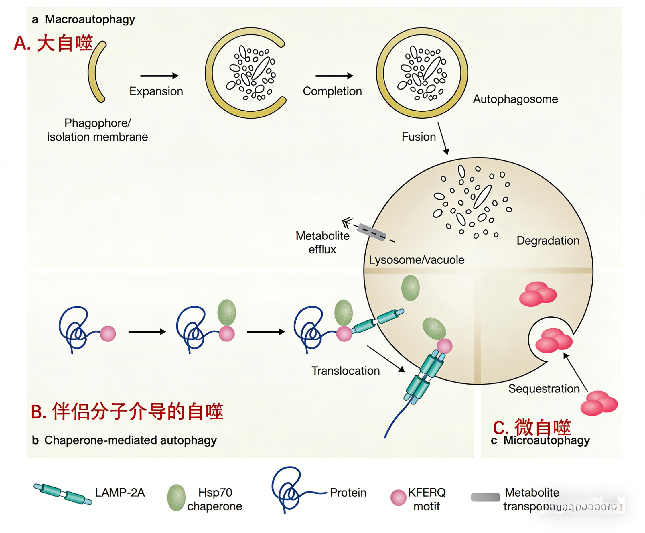 一、自噬的基本概念与生物学意义 自噬(Autophagy)是一种高度保守的细胞自我调节机制,广泛存在于真核生物中。通过该过程,细胞能够识别并包裹自身受损的细胞器、错误折叠的蛋白质及其他多余或有害组分,进而将其运输至溶酶体进行降解,并将降解产物重新利用,以维持细胞内部的稳态与功能完整性。自噬在细胞质量控制、代谢适应以及机体发育与免疫应答中发挥关键作用。二、自噬的主要分类 根据细胞内物质被运送至溶酶体