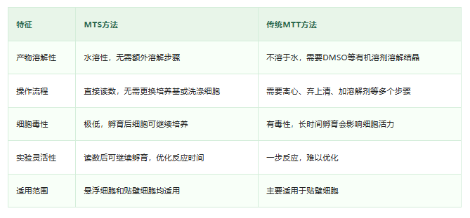 只需将一种水溶性试剂加入细胞培养孔,几小时后颜色深浅就能精确反映细胞增殖情况。MTS检测试剂盒的核心是基于水溶性MTS化合物的比色法检测方法,能够定量评估活细胞数量和代谢活性。它通过活细胞中的脱氢酶将MTS还原为水溶性的甲臜产物,该产物在490-500 nm波长处有特征吸收峰,其吸光度值与细胞数量成正比。这一技术已成为生物医学研究中评估细胞增殖、毒性和活力的核心工具。01 检测原理与机制MTS是“