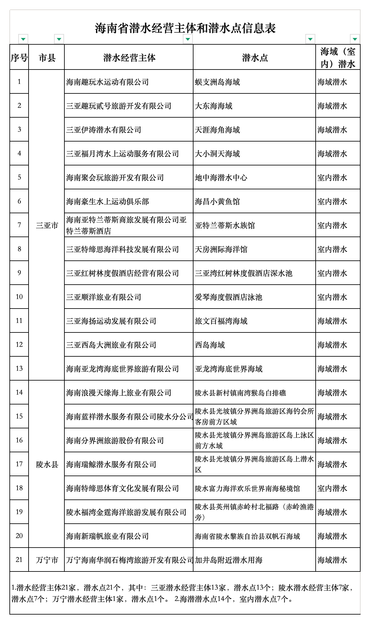 近日,海南省旅游和文化广电体育厅公布海南省潜水经营主体和潜水点信息表,共计21家潜水经营主体、21个潜水点位纳入名单。此次公布的21家合规潜水经营主体,覆盖三亚、陵水、万宁等地。其中,三亚市共有13家经营主体、13个潜水点,涵盖蜈支洲岛、大东海、天涯海角、西岛、亚龙湾等省内知名滨海旅游目的地;陵水黎族自治县有7家经营主体、7个潜水点,集中在分界洲岛、南湾猴岛白排礁等优质潜水海域;万宁市1家经营主体