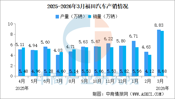 中商情报网讯:2026年3月,福田汽车产量8.83万辆,同比增长14.63%。销量8.68万辆,同比增长19.02%。累计产量20.18万辆,同比增长10.14%。2026年1-3月,福田汽车累计销量18.35万辆,同比增长7.82%。 2026年3月,福田新能源汽车产量1.05万辆,同比减少14.67%。销量1.07万辆,同比减少1.44%。累计产量2.47万辆,同比减少9.32%。2026年1
