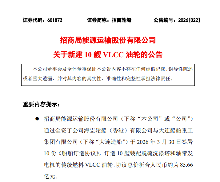 在近期全球油运市场持续活跃的背景下,多家中国造船企业相继斩获新单,涵盖不同吨位、不同类型,船型均兼具环保与高效优势,彰显了中国船舶工业在油船建造领域的强劲实力与全球竞争力,也契合全球航运绿色转型趋势。招商轮船在大连造船订造10艘VLCC近日,招商局能源运输股份有限公司发布公告称,该公司通过全资子公司海宏轮船(香港)有限公司在中国船舶集团有限公司旗下大连船舶重工集团有限公司订造10艘超大型油船(VL