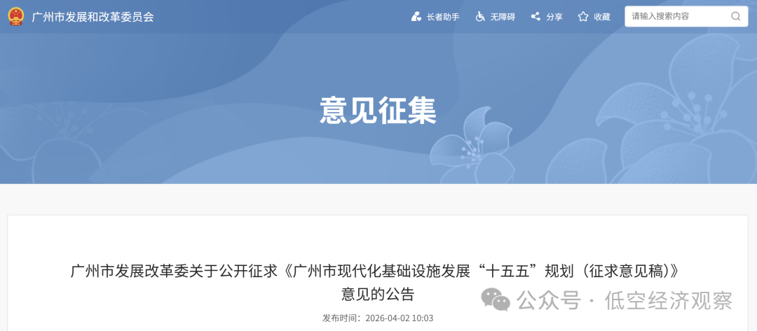 4月2日,广州市发展改革委发布《广州市现代化基础设施发展“十五五”规划(征求意见稿)》。文件提出,构建低空产业体系,加快低空经济发展,明确建立重点低空产业链、构建多场景全航程整机产品矩阵、锻造关键系统本地化配套体系等重点方向。低空起降设施布局方面,构建“一级低空起降枢纽-二级低空起降枢纽-三级低空起降点”分级分类体系,打造分级低空起降设施布局,形成“全场景、多层次、立体化、广覆盖”的低空飞行服务网