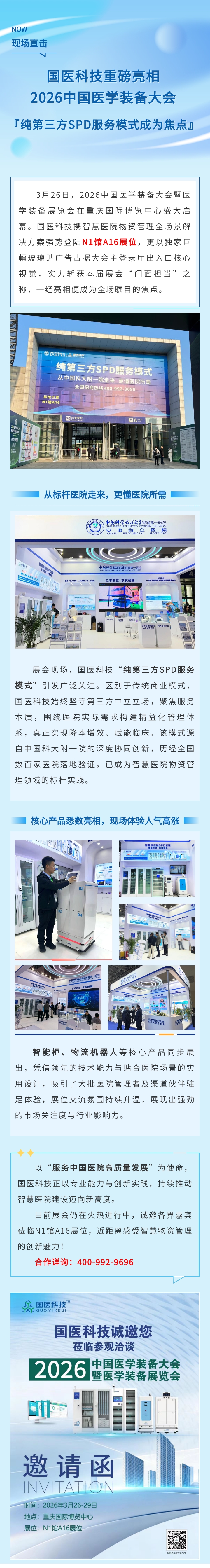 3月26日,2026中国医学装备大会暨医学装备展览会在重庆国际博览中心盛大启幕。国医科技携智慧医院物资管理全场景解决方案强势登陆N1馆A16展位,更以独家巨幅玻璃贴广告占据大会主登录厅出入口核心视觉,实力斩获本届展会“门面担当”之称,一经亮相便成为全场瞩目的焦点。从标杆医院走来,更懂医院所需展会现场,国医科技“纯第三方SPD服务模式”引发广泛关注。区别于传统商业模式,国医科技始终坚守第三方中立立场