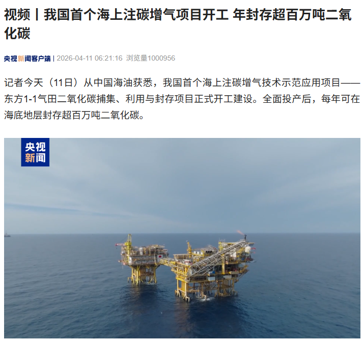 IT之家 4 月 11 日消息,据央视新闻报道,记者今天从中国海油获悉,我国首个海上注碳增气技术示范应用项目 —— 东方 1-1 气田二氧化碳捕集、利用与封存项目正式开工建设。全面投产后,每年可在海底地层封存超百万吨二氧化碳。报道称,注碳增气技术全称二氧化碳强化天然气采收率技术,是将天然气开采过程中产出的二氧化碳“变废为宝”,通过捕集提纯后加压回注到含气地层,既实现封存,又成为驱动难采天然气采出的