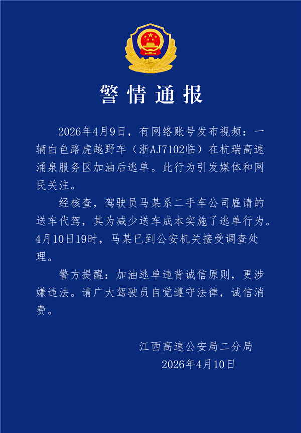 快科技4月11日消息,本月9日发生一起加油逃单事件,一名男子驾驶无牌白色路虎SUV,加油近500元后,以车内付款为由,上车后随即驾车加速驶离。针对此事,昨日江西高速公安局二分局发布警情通报:2026年4月9日,有网络账号发布视频:一辆白色路虎越野车(浙AJ7102临)在杭瑞高速涌泉服务区加油后逃单。此行为引发媒体和网民关注。经核查,驾驶员马某系二手车公司雇请的送车代驾,其为减少送车成本实施了逃单行