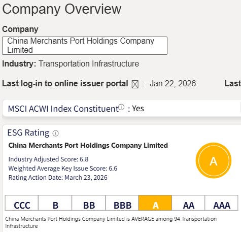 3月23日,明晟(MSCI)公布基于ESG评级方法论5.0版本的招商局港口(0144.HK)ESG最新评级结果,从BBB级提升至A级,这标志着公司在可持续发展的战略制定与实施、管理体系建设与信息披露等方面已经跻身港口行业全球领先水平。这一成绩源于公司对可持续发展理念的坚定践行:在公司董事会的领导下,公司持续贯彻落实“绿色低碳、安全可靠、创新发展、人文关怀”四大支柱理念,并且紧跟国际、国内ESG新规