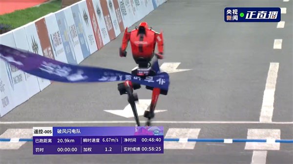 界面新闻记者 | 宋佳楠 4月19日,北京亦庄赛道上,齐天大圣队的“闪电”机器人凭借50分26秒(净用时)的成绩(人类半程马拉松世界纪录为56分42秒)获得2026人形机器人半马冠军。 由荣耀研发的“闪电”机器人身高169cm,外观采用机甲流线型设计,主体为亮红色,胸甲有蓝色灯组与“HONOR”标识。该机器人后背高功率液泵,可实现每分钟超4升的换热流量,以解决电机长时间运转的发热难题,同时配合20