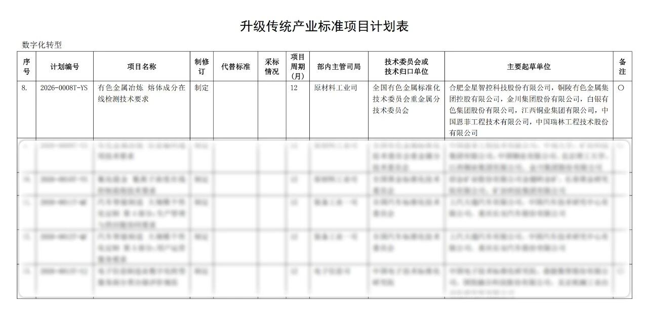 近日,国家工业和信息化部正式发布《2026年第一批行业标准制修订和外文版项目计划》,由金星智控牵头申报的《有色金属冶炼熔体成分在线检测技术要求》(计划编号:2026-0008T-YS)行业标准获批立项。这标志着我国有色金属冶炼熔体成分在线检测领域即将迎来首项行业技术规范,将有力推动行业从取样离线化验室检测迈向在线原位检测。 工业和信息化部2026年第一批行业标准制修订和外文版项目计划 熔体成分作为