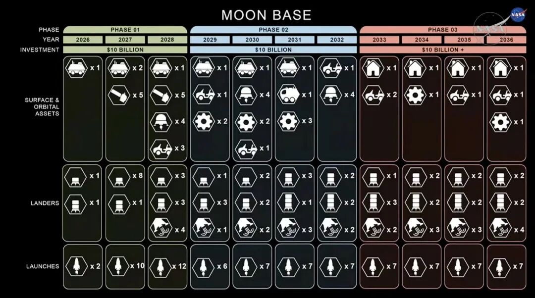 与阿波罗时代六年六次登月的节奏相比,NASA现在追求的是工业化级别的任务频率。目标是在三年内完成约30次着陆任务,为永久基地铺设基础设施。