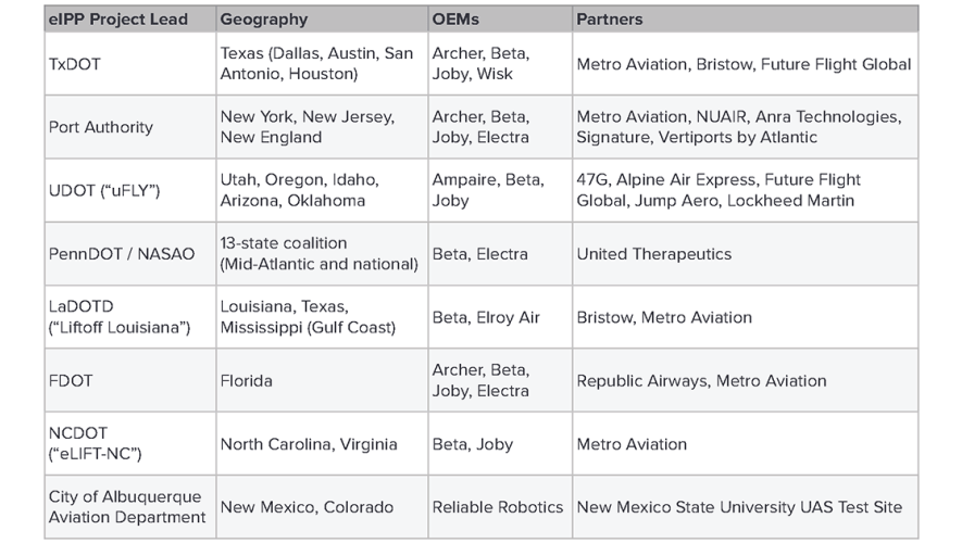 从30多个提案中选出的8个eIPP项目跨越26个州,涉及数十个行业合作伙伴,涵盖了从海上石油物流和器官运送到消防的用例,远远不止是富裕乘客的eVTOL空中出租车运营。这八个项目共同构成了美国政府有史以来最大的AAM协同实验。