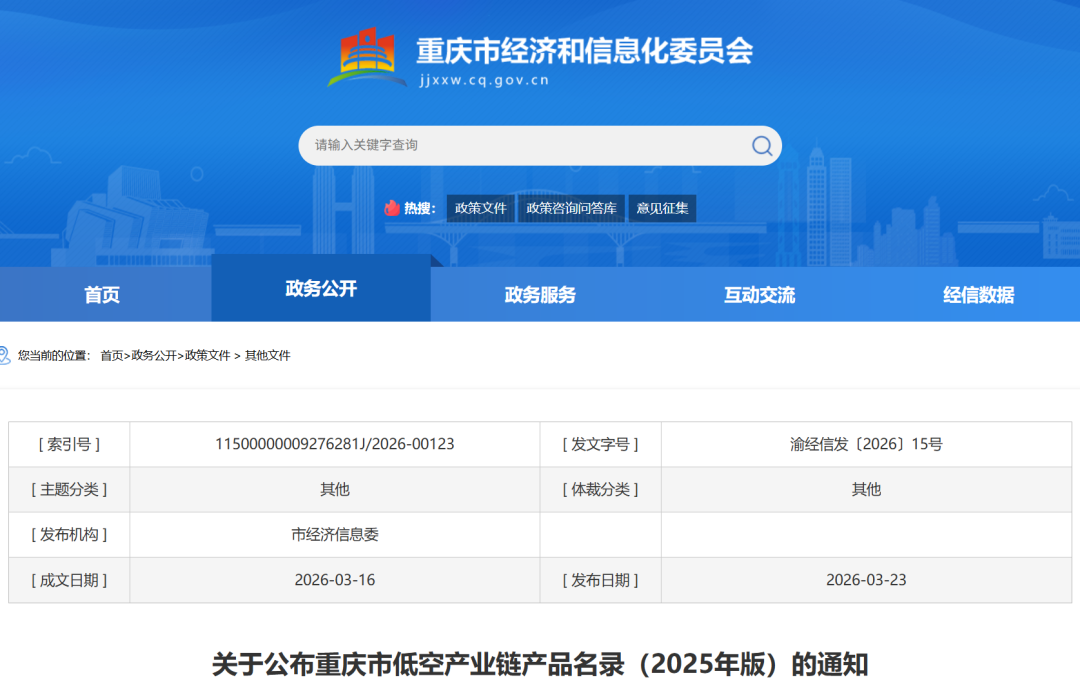 3月23日,市经济信息委、市发展改革委联合发布《重庆市低空产业链产品名录(2025年版)》,覆盖低空飞行整机、部件、能源补给、检验