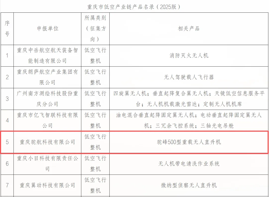 低空经济“硬核重器”!“驼峰”500型入选重庆市低空产业链产品名录