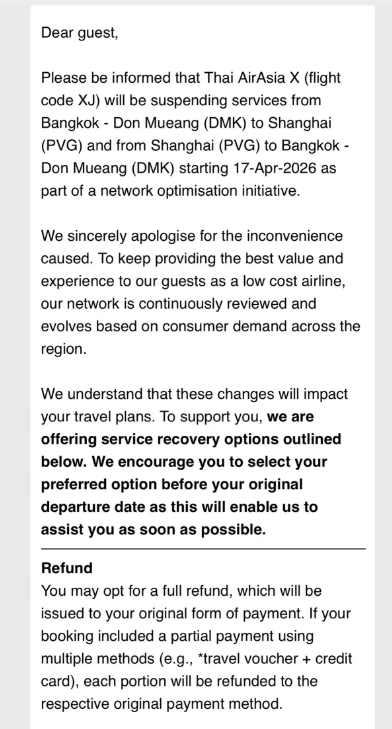 网传泰国亚航长途(Thai AirAsia X)发布最新通知称,由于航线网络优化,自2026年4月17日起暂停曼谷廊曼-上海浦东和上海浦东-曼谷廊曼航线。