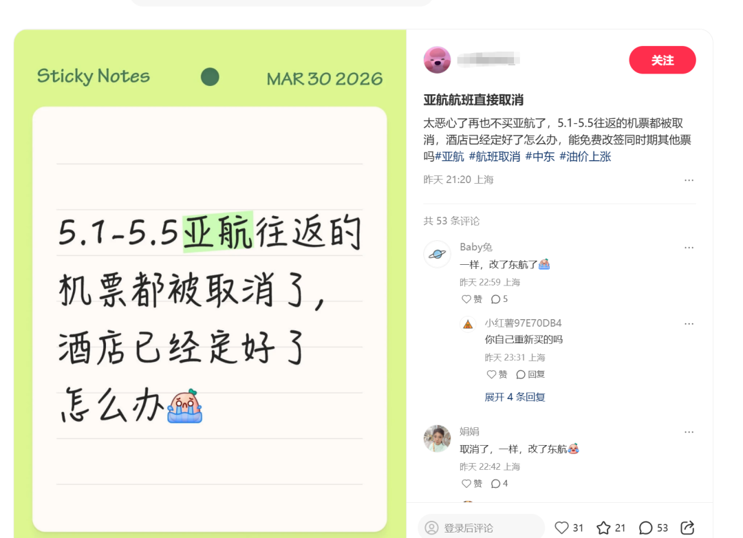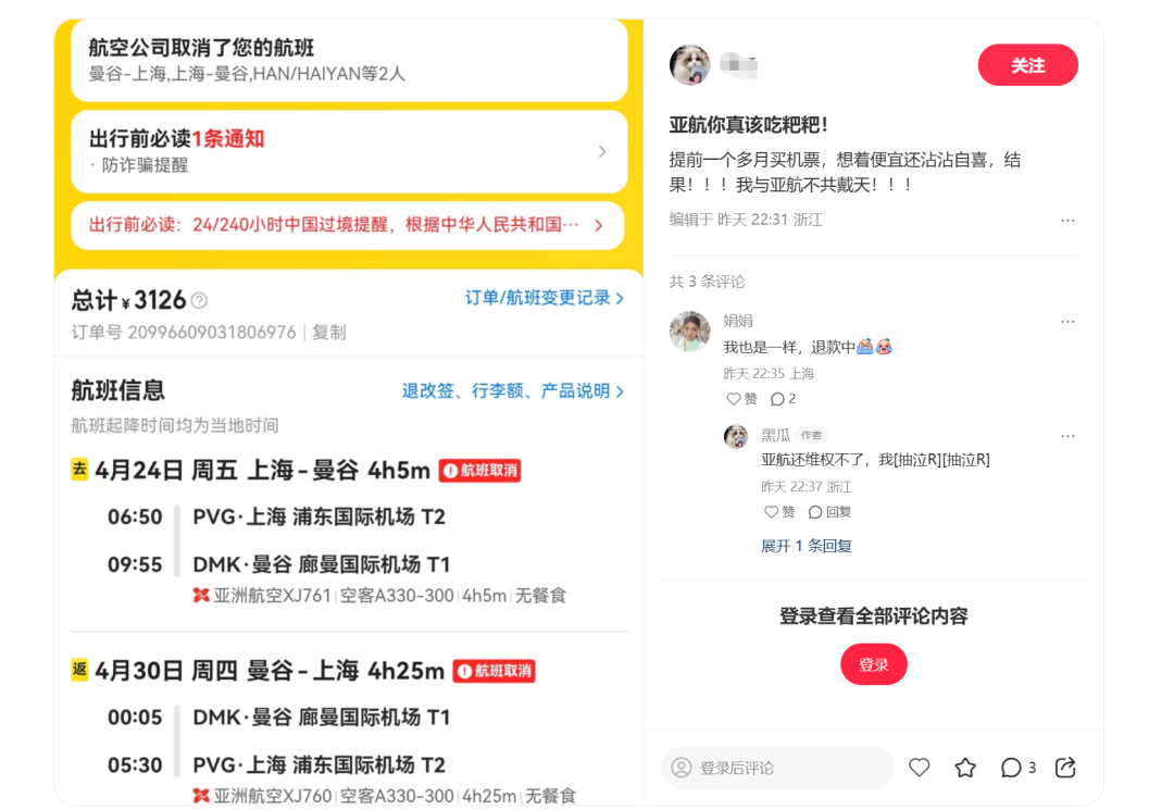 不少网友在社媒上纷纷发帖声讨。有网友称:“5.1-5.5往返的机票都被取消”